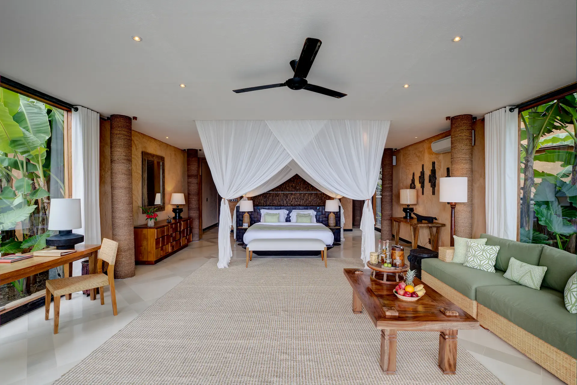 THE OWNER’S ESTATE is a 9 bedroom residence, the resort’s largest estate: A private five-villa enclave stretches along the headland, giving every bedroom an Indian-Ocean panorama. Guests can rotate between a lap pool, cliff-edge infinity, waterfall and cold-plunge pools, then watch a film in the open-air cinema or work out in the gym. A dedicated host team with buggies keeps multi-generation groups moving effortlessly. A personal Guest Kapten is included, to take care of all your needs during your stay.