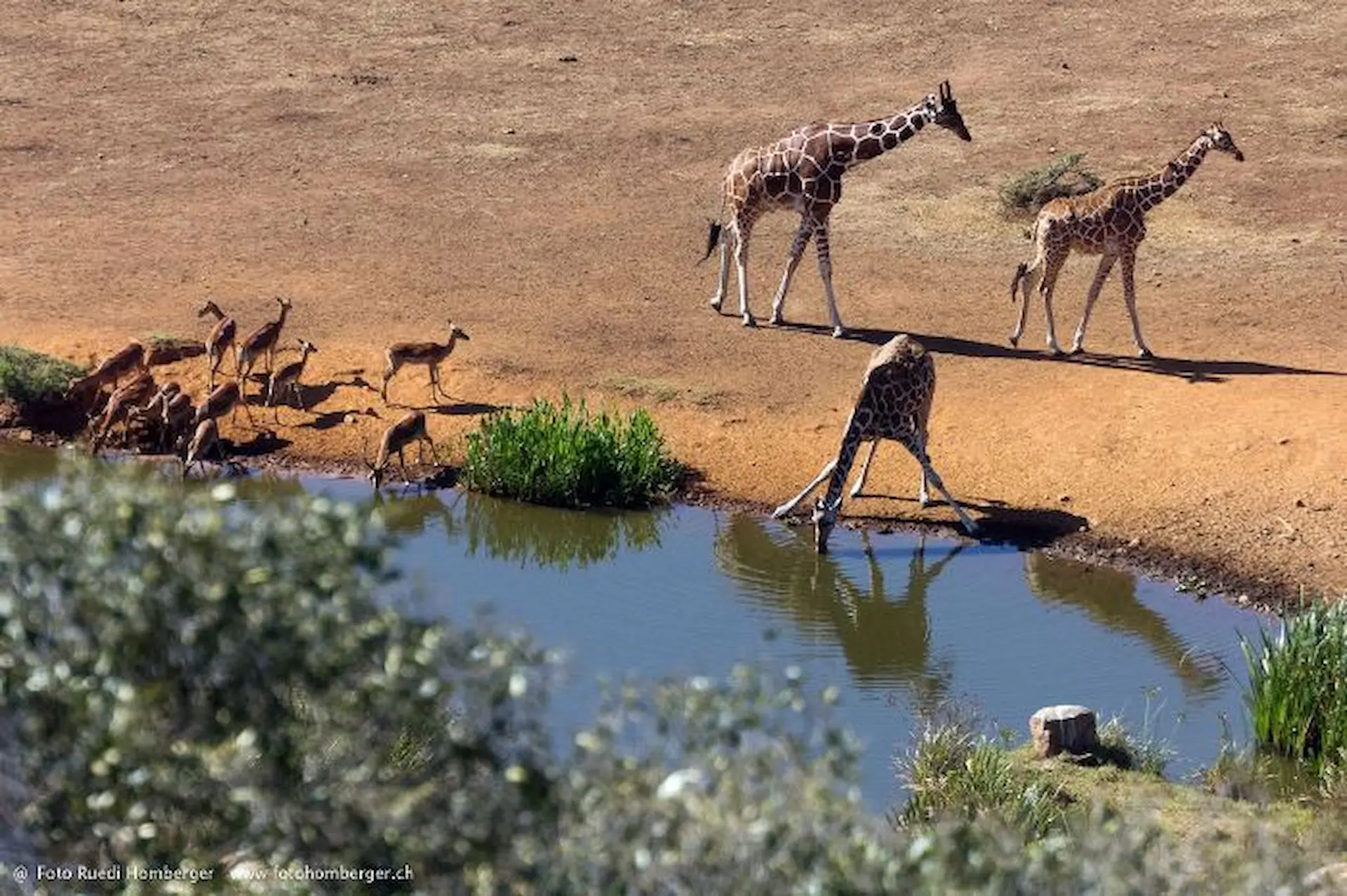 Spend dawn to dusk in a sunken viewing tunnel as elephants, zebras, and rhino drink steps away. Disappear into the earth and watch the wild come to you.