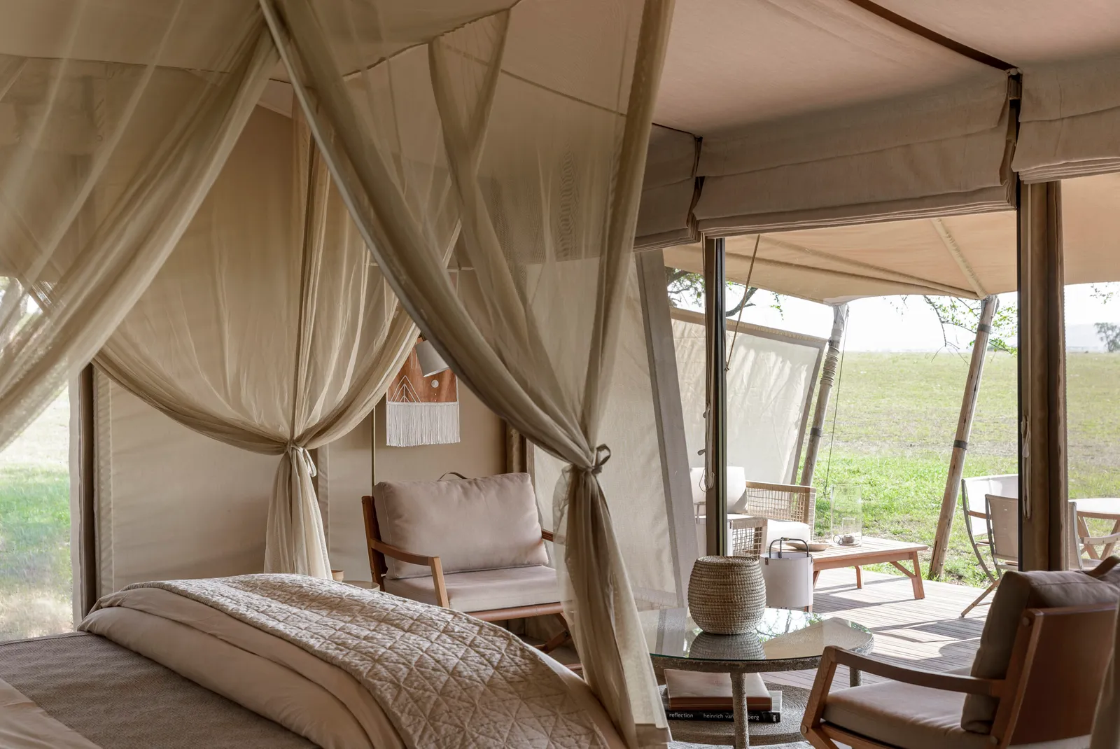 Stylish tented suite with en suite bathroom, outdoor shower, private deck, daybed, and uninterrupted views of the Serengeti grasslands.