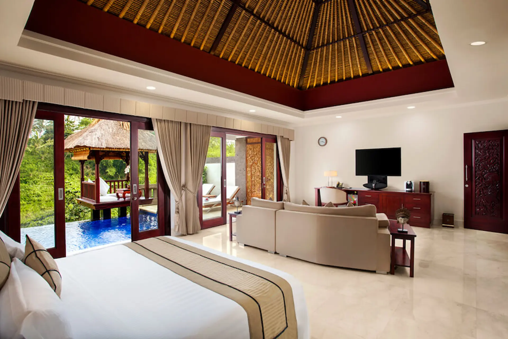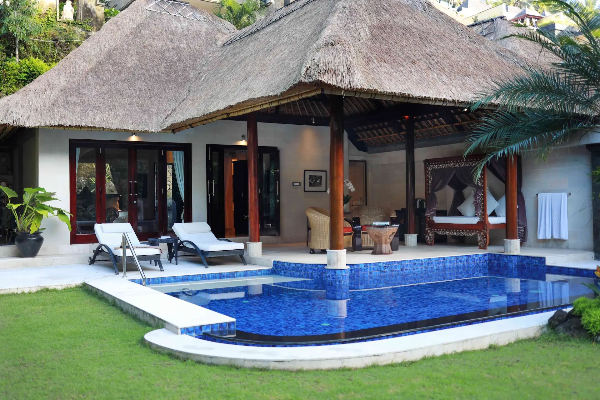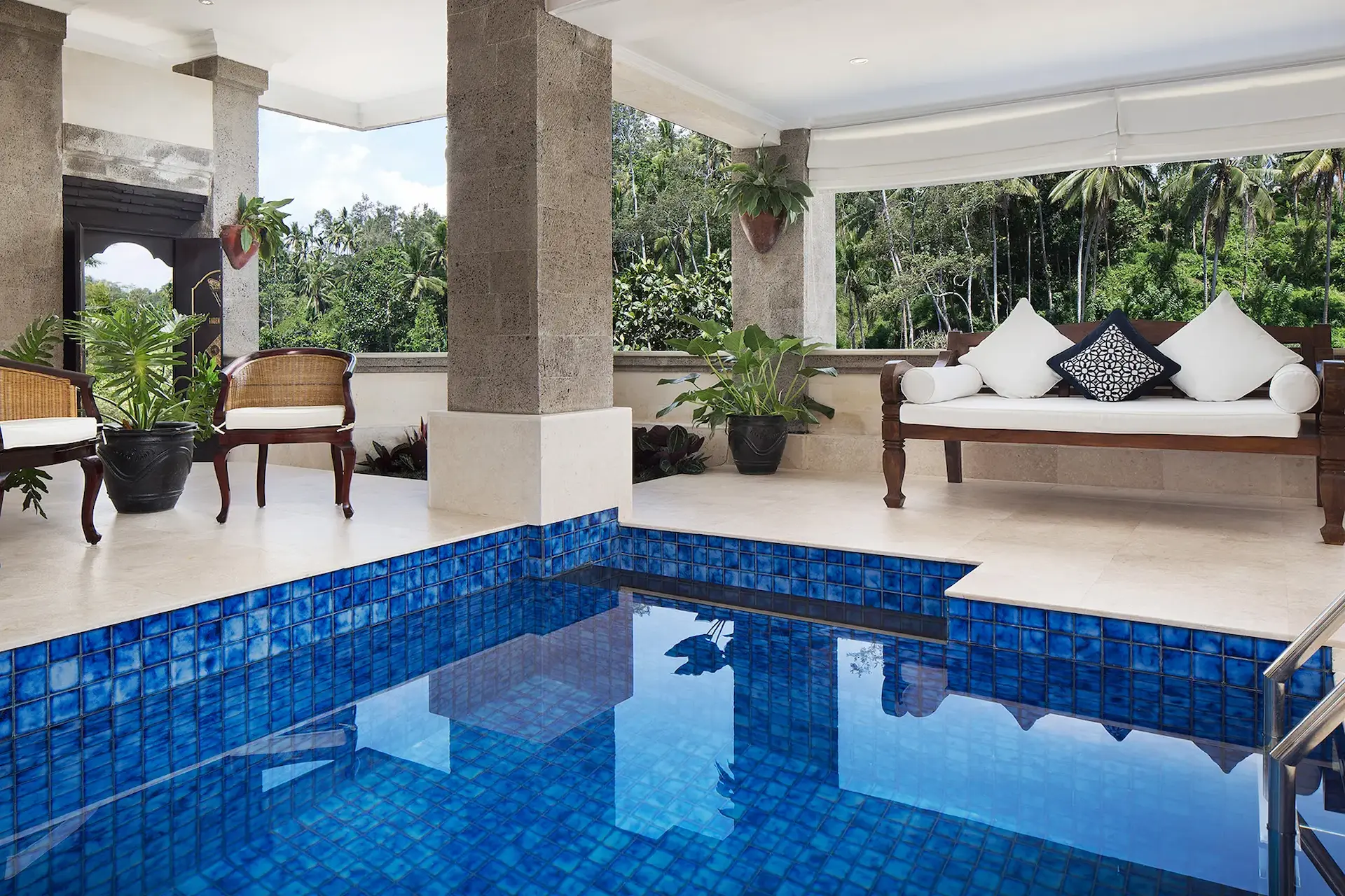 An open-plan semi outdoor bathroom that leads to a covered heated plunge pool